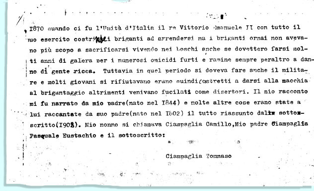 In paese per non essere aggrediti dai briganti alla sera si chiudevano le quattro porte che permettevano l'ingresso nei rispettivi quattro angoli del paese. Nelle case dei signori invece c'erano i feritoi che corrispondono ai portoni usati anch'essi per difendersi dai briganti. Causa la cattiva alimentazione e l'insufficienza igienica molti erano i bambini che morivano. Mio padre raccontava che nel 1860 quando lui aveva ancora sedici anni la popolazione non aveva iniziato a migrare verso territori lontani si viveva di quel po’ che si produceva, molti infatti avevano nelle case un telaio con il quale si tessevano panni di lana e di lino mediante la vendita dei quali si riusciva a guadagnare il denaro a volte insufficiente per comperarsi il sale che era necessario. Le povere donne madri di famiglia durante l'estate si recavano a fare le ciociare per sfamare i loro figli, la mattina, di buon ora si recavano anche nel bosco per fare un fascio di ceppi. Quando ritornavano tutte sudate ed affaticate avendo lasciato i loro piccoli a letto dovevano allattarli ma il latte riscaldato dal loro trapazzo faceva ammalare i loro piccoli. L'ignoranza spingeva le donne a credere che quel male fosse dovuto alle streghe alle quali si credeva molto, si recavano quindi da qualche falso fattucchiere il quale non faceva altro che derubare dei propri soldi quella povera gente, intanto però il bambino moriva e quella povera donna diventava mal vista da tutti ed etichettata come una strega. Come si può vedere quindi l'ignoranza dilagava e l'analfabetismo raggiungeva il novanta per cento. Questo non veniva raccontato da una sola persona ma lo raccontava anche un altro uomo soprannominato Marianuccio che era un tipo molto grande, una guardia di finanza nato nel 1840. E continuamente tutto ciò che era successo in quell'epoca io ero ragazzo, avevo quattordici o quindici anni ma molte cose mi sono rimaste impresse e le sto scrivendo mentre mi trovo nella casa di mia figlia Luisa a Vimercato (n.d.r. Vimercate) provincia di Milano data 15 marzo I977 la mia età é di 69 anni nato il 1908 a Rivisondoli, scrivo per passare il tempo. Il racconto continua sempre dal 1860 a1 I870. I1 regno delle due Sicilie cioè Sicilia Calabria Lucania Puglie ed Abruzzo era stato posseduto da Re Francesco II di Borbone di Spagna. Quando arrivò per la prima volta nelle Puglie con le sue carrozze ed il seguito che lo accompagnava vide tutti i campi abbandonati, Si rese subito conto che tutta quella terra poteva essere come pascolo ed avrebbe costituito, una grande risorsa per il popolo, ma la gente non poteva svolgere questo lavoro per alcune ragioni: erano quasi tutti malati avevano la febbre di malaria ed altre malattie bevevano infatti acqua di pozzi piena di insetti non vivevano oltre i quaranta anni quindi nei paesi c'era pochissima gente. Quando il Re é arrivato in Abruzzo ha visto la gente che malgrado le miserie era in salute disse quindi che la gente d'Abruzzo era forte e gentile avrebbe potuto recarsi nelle Puglie ed a loro avrebbe provveduto nell'assegnazione delle terre. Fu così che i signori sindaci di questi paesi si recarono in solitudine nelle Puglie per l'assegnazione delle terre senza rendere nota la notizia ad alcun cittadino di buona volontà che avrebbe voluto anch'egli essere proprietario di terre. Dopo avere assegnato la terra il Re provvedette ad importare centinaia di pecore dalla Spagna regalandole a questi signori alla sola condizione di non ammazzare le agnelle femmine e di consegnare gli agnelli maschi al governo. La terra fu assegnata ai signori amministratori di Rivisondoli famiglia Caniglia Mascio e Gasbarro; a Roccaraso famiglia Agelone (n.d.r. Angeloni) a Pescocostanzo Decapite, a Roccapia De Neis a Scanno Rienzi e ad altri proprietari che io non conosco e che sono sempre nella nostra zona d'Abruzzo. Dopo pochi anni il loro gregge cresceva rapidamente, acquistarono quindi un piccolo numero di vacche e come guadagnavano soldi comperavano cavalli ed altri animali. Col passare del tempo le loro masserie si ingrandivano e poiché a quell'epoca mancava totalmente il fenomeno dell'emigrazione tutti gli uomini ed i ragazzi si dedicavano a fare i pastori.