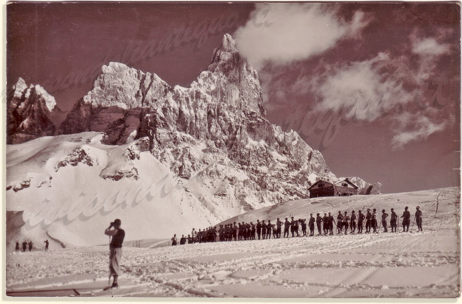 Le foto presenti in questa pagina, datate tra gli anni 1930 e 1932, sono tra le poche salvatesi dalla distruzione che la seconda guerra mondiale ha determinato a Rivisondoli. La robustezza della cassapanca ove erano conservate, e la trave provvidenzialmente adagiatasi su di essa, hanno fatto da scudo al crollo della restante porzione del tetto di casa colpito da una cannonata delle forze belligeranti. Le "squandre" ed i calcinacci hanno poi ricoperto, protettivi anche contro gli immancabili "sciacalli", il contenuto che parzialmente proponiamo, dal valore affettivo inestimabile . La foto a sinistra venne realizzata quando Luigino entrò a far parte nel gruppo sportivo S.C. Fiamme Gialle di stanza a Predazzo (Tn.). [[ La Scuola Alpina avvia l’agonismo sulle nevi di Passo Rolle, sotto la guida di esperti istruttori, molte giovani reclute provenienti dalle vallate alpine e dall’Abruzzo. Lo sport della neve viene inteso soprattutto come espressione limite dell’attività addestrativa e come mezzo per formare e migliorare nuove leve nelle |