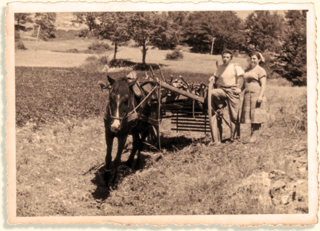 Questa magnifica istantanea, che riprende un momento di tranquilla vita bucolica, luminosa a sottolineare il grano maturo e pronto per la raccolta, non lascia (fortunatamente) presagire gli accadimenti che segneranno a breve la storia del nostro paese. Siamo infatti nell'agosto del 1943, e l'attenzione dei paesani è tutta volta a racimolare le poche risorse disponibili per la sopravvivenza, ed il grano è una delle poche che sia possibile coltivare sulle nostre montagne. Il somaro in alto, ripreso mentre è intento a brucare pigramente in tutta tranquillità, contrasta con la determinazione stampata sul volto di Costantina che impugna la "sarrecchia" con piglio all'apparenza corrucciato e volitivo (probabilmente non abituata alle fotografie, cerca solo di celare il proprio imbarazzo). Più rilassati, mentre abbozzano un timido sorriso sono la ragazza con il foulard chiaro (della quale purtroppo si è persa memoria), e Giuseppe con la tipica tuta da lavoro, in jeans, modello "farmer americano over alls" (rivisondolizzato in "ovra olz"). |