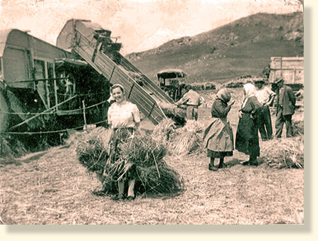 Margadonna scrisse sulla rivista "IL SECOLO XX" Anno 30° - n. 30, del 18 settembre 1931. I due bambini, entrambi a piedi nudi e nel tipico abbigliamento distintivo dei sessi nel mondo contadino, sono stati ripresi durante una breve pausa dell'estenuante lavoro al quale partecipavano sin dai primi anni di vita. Nella sequenza fotografica che segue abbiamo poi raggruppato le immagini riferite alle prime trebbie meccanizzate, azionate da macchine a vapore, tratte sempre dai volumi menzionati nei paragrafi precedenti. Sequenza che abbiamo integrato con macchinari di periodi più recenti, e che svolsero la medesima attività a Rivisondoli, e nel territorio degli Altipiani Maggiori d'Abruzzo. Immagini tutte che si ricollegano a quella d'apertura, quasi a cingere in una salda corona protettiva ricordi, emozioni, fascino ed atmosfere vissute da alcuni di noi, e che con rimpianto nostalgico desideriamo portare all'attenzione delle nuove generazioni, per rinsaldare in esse la consapevolezza delle proprie radici contadine. |