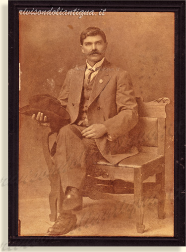 E sulla sinistra ecco la foto da studio fatta contestualmente alla ripresa utilizzata per la realizzazione del quadro che abbiamo appena mostrato. L'impietoso trascorrere del tempo ne segna inevitabilmente la superficie, ed il viraggio seppia, per la reazione chimica del bagno di fissaggio che oltre 110 anni fa impregnò le fibre di cellulosa, attenua inesorabile il contrasto dell'immagine. Sottolineiamo il "set" stereotipato secondo i canoni dell'epoca che imponevano un drappeggio uniforme sullo sfondo, e l'arredo in stile, in questo caso una piccola panca, che aiutava a restare fermi per tutti quei secondi che le lastre al bromuro d'argento richiedevano per impressionare l'immagine. Noi immaginiamo il fotografo sotto la cappa nera delle grandi macchine piane, che scandiva il passare dei secondi ad un compassato Antonio, in una posa rilassata e nel contempo elegante, anche nel sorreggere il cappello a larghe tese. E mille altre le sensazioni che soltanto le fotografie d´epoca possono evocare, specie se affettivamente non irrilevanti. Noi nell'osservare quel cappello stile "cowboy" rivediamo Antonio nella prateria americana ove, contribuì alla costruzione della ferrovia che congiunse le due sponde del continente americano, confuso tra migliaia di emigranti europei, loro troppo intenti nella quotidiana fatica per accorgersi dell'epopea che si realizzava intorno a loro, ed enfatizzata successivamente nella filmografia USA. Per Antonio, pastore di Rivisondoli, figlio di buttero di Frattura quel lavoro in America protrattosi per 11 anni, scandito dai tre viaggi del 1899, 1905 e 1910 rappresentava soltanto la realizzazione della casa per se e la propria famiglia, che incrementava ad ogni suo ritorno a casa. |